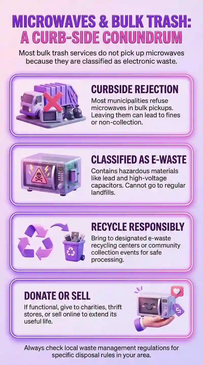 The confusion is understandable. "Bulk trash" sounds like it means "anything big." But bulk collection accepts furniture, mattresses, and large household items while specifically excluding electronic waste and appliances with hazardous components. Microwaves are classified as e-waste requiring separate disposal procedures, regardless of collection day timing or item size.