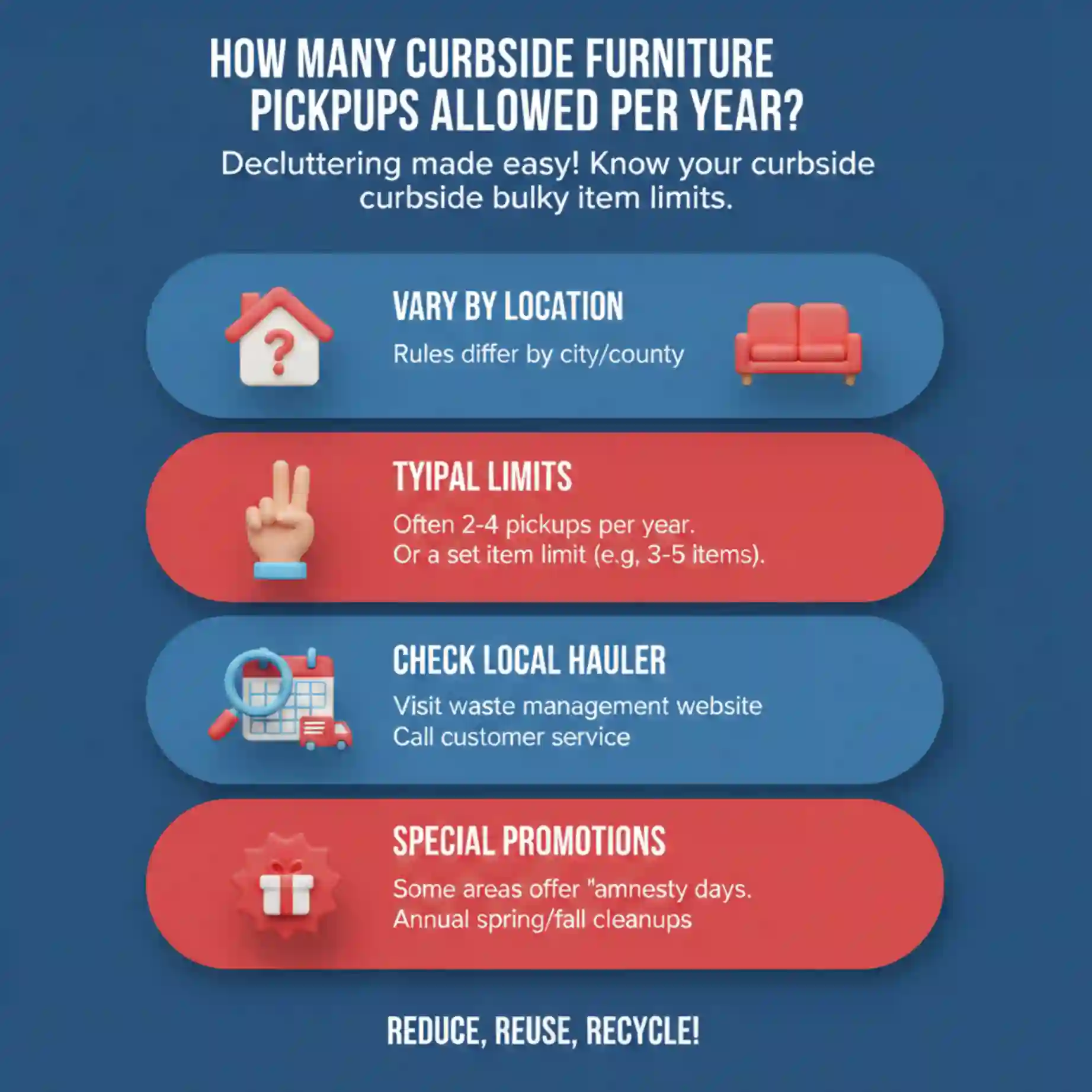 Your curbside limit isn't annual—it's per collection cycle, which typically runs every 1-2 weeks depending on your municipality. Most waste management programs allow one large furniture item (like a couch, dresser, or bed frame) per cycle. Some cities are more generous and permit two items, while others stick strictly to one.