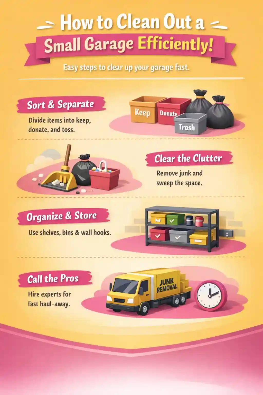 Cleaning out a small garage efficiently is not about buying more bins or adding more shelves. It is about using the right process in the right order.