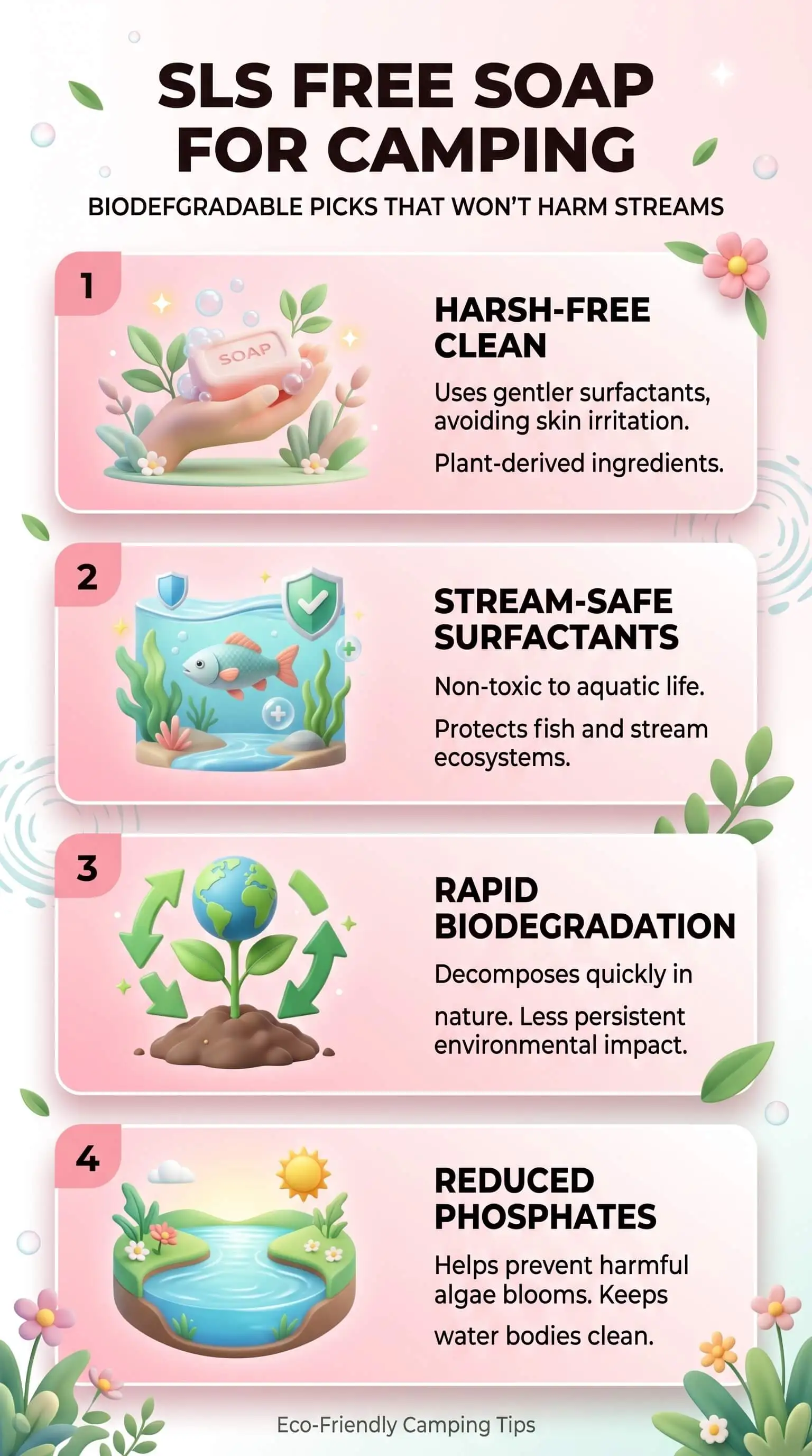 SLS free soap is any cleansing product made without sodium lauryl sulfate, the sulfate surfactant that produces thick foam in conventional shampoos, body washes, and dish soaps. Plant-derived surfactants like coco-glucoside, decyl glucoside, or saponified olive and coconut oils do the cleaning instead. For outdoor use specifically, SLS-free matters because sodium lauryl sulfate is toxic to fish and aquatic invertebrates at concentrations as low as 0.1 mg per liter, and a "biodegradable" label alone does not make a soap stream-safe.