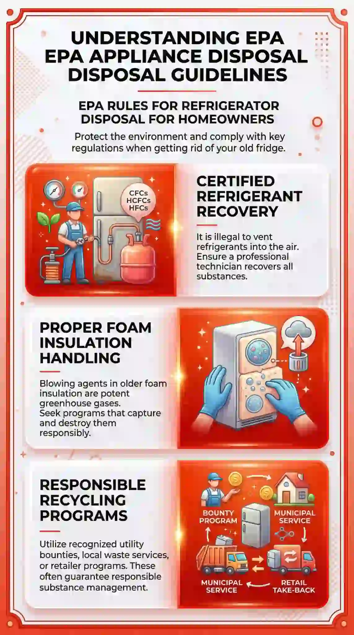 The EPA's Responsible Appliance Disposal Program identifies utilities, retailers, and recyclers that go beyond minimum federal requirements on refrigerant and foam recovery. Before your removal date, use this resource to locate compliant pickup options near you — some even offer rebates for working units. https://www.epa.gov/section608/appliance-disposal