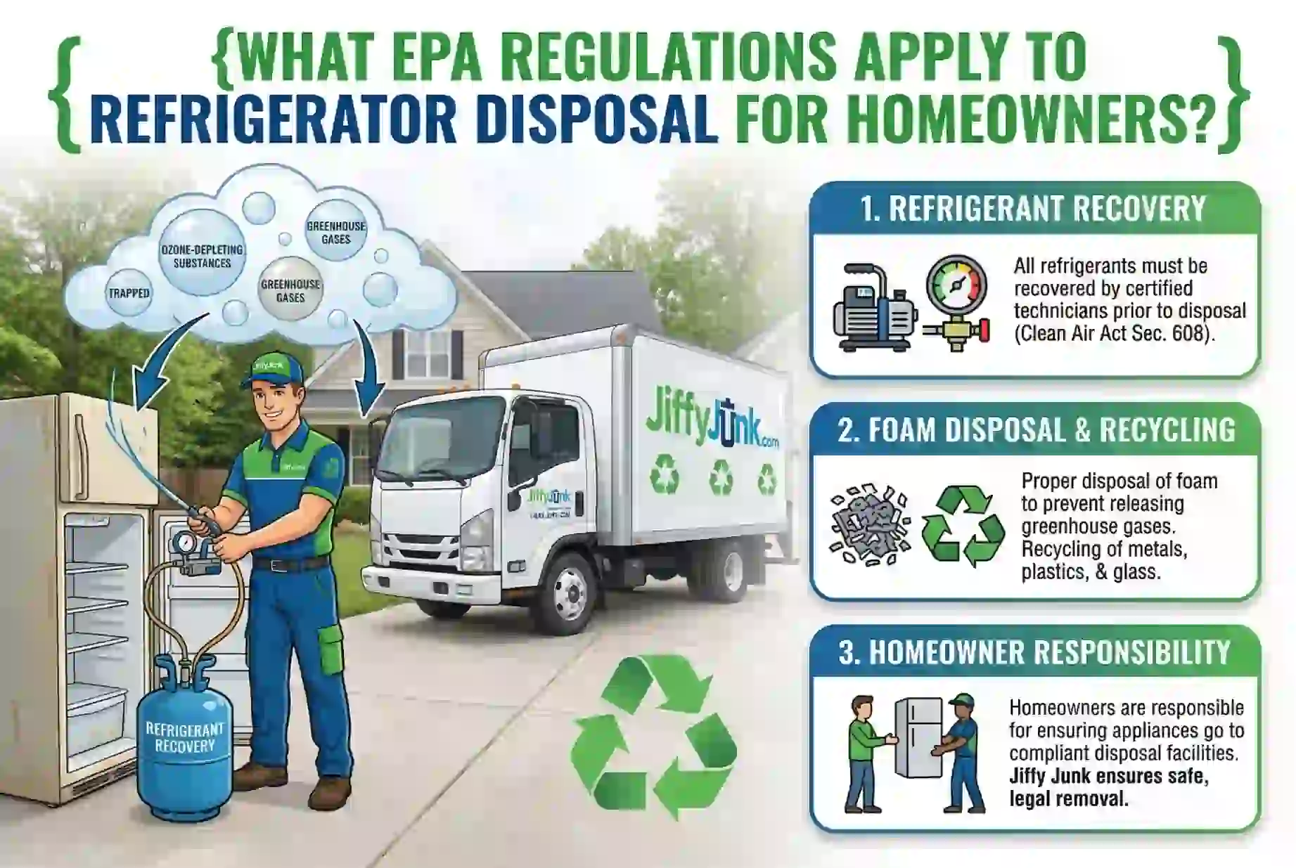 This page walks you through exactly which EPA regulations apply to you as a homeowner, what Section 608 compliance actually looks like in practice, and how Jiffy Junk handles every step of fridge pick up, removal, haul away, and disposal so you don't have to navigate it alone.